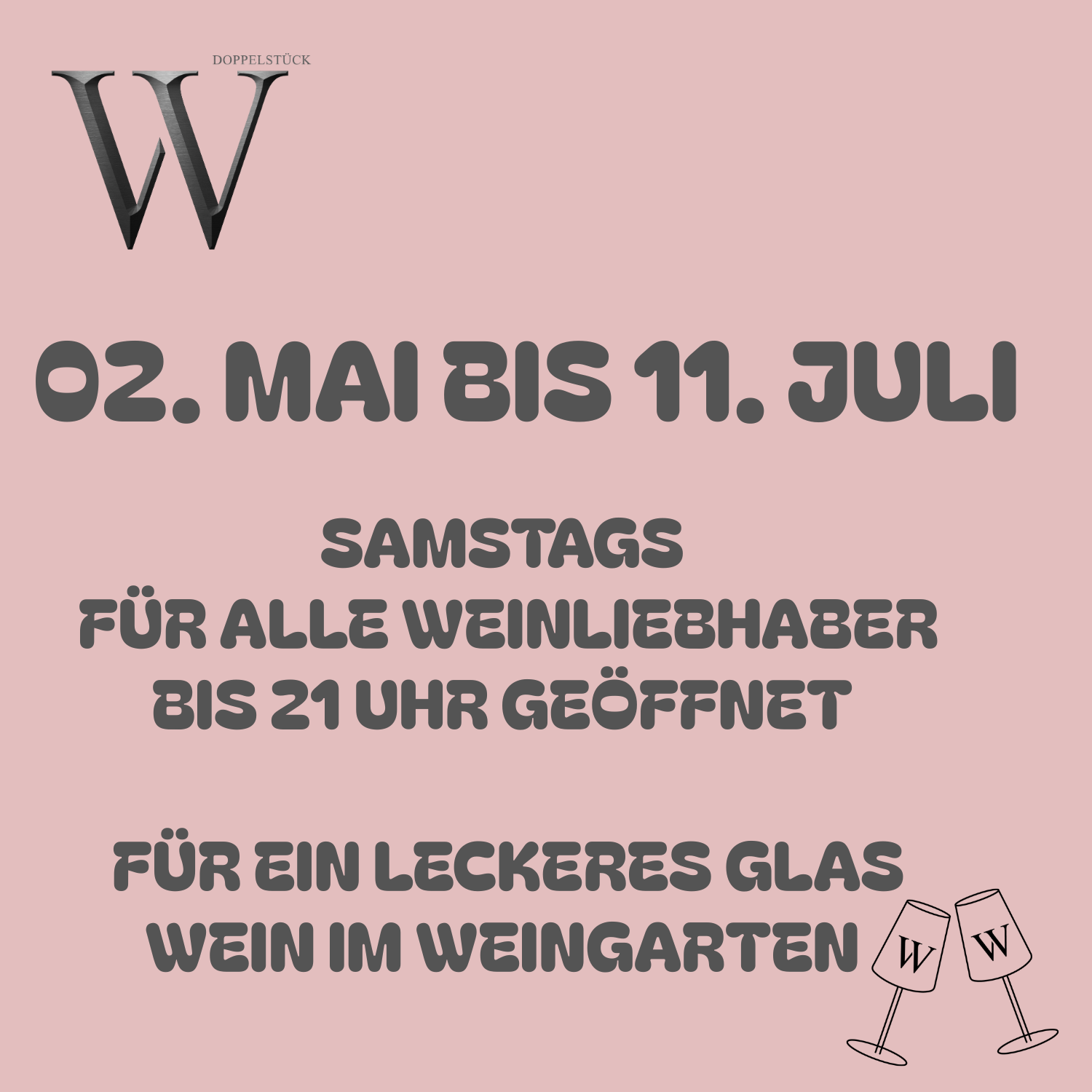 Der Sommer kann kommen! Von 02. Mai bis 11. Juli 2026 laden wir euch jeden Samstag herzlich ein, den Tag bei einem Glas Wein in unserem Weingarten ausklingen zu lassen.
